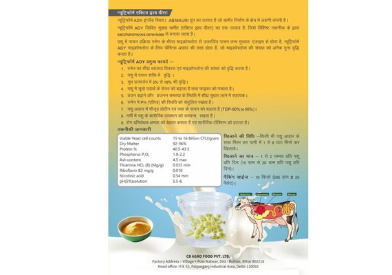 We offer animal pro-biotic Nutriferm Active Dry yeast for our valued customers. It is live yeast, help in increasing the number of micro flora in rumen digestion and increase milk secretion by 3 to 18 % on regular 15 days intake. Major benefits of NUTRIFERM ADY are:- Quick heeling of rumen health, increase digestibility and dry fodder intake, stop breeding problems, Increase milk secretion and falling of milk in summer session, maintain pH and acidosisof rumen and help in growing the immune power.